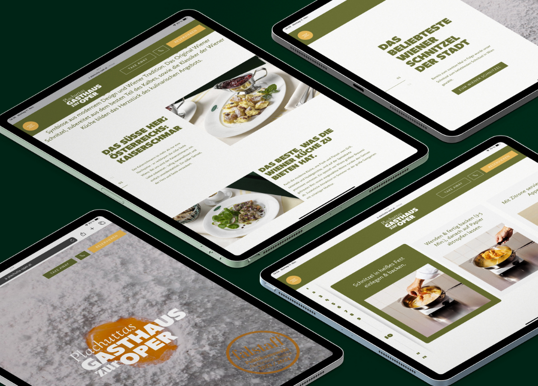 Besonderes Augenmerk legten wir auf die Traditionshäuser Plachutta Wollzeile, Hietzing und Nussdorf, bei denen wir ein vollkommen neues Webdesign entwickelt haben, das auch einen benutzerfreundlichen Onlineshop für die beliebten Plachutta-Kochbücher integriert. Auch das Gasthaus zur Oper, bekannt für das "beliebteste Schnitzel der Stadt" (Publikumsvoting by Falstaff), wurde von uns neu gestaltet, um die Besonderheit dieses Lokals digital erlebbar zu machen.