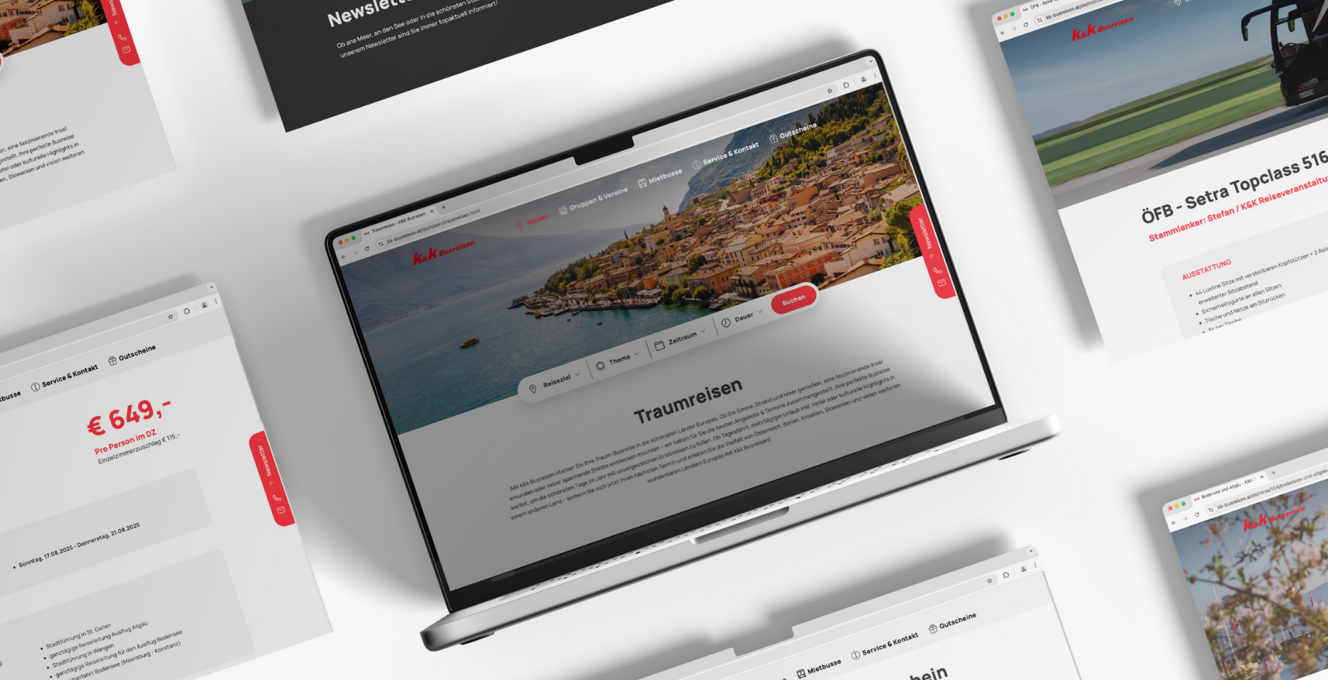 Um das Erlebnis noch ansprechender zu gestalten, haben wir das gesamte Design der Website auf den neuesten Stand gebracht – modern, klar und benutzerfreundlich. Ein besonderes Highlight: Im Vorfeld haben wir ein Fotoshooting der gesamten Busflotte organisiert, um die Busse und Reisen authentisch in Szene zu setzen und die Qualität der K&K Angebote visuell hervorzuheben.
