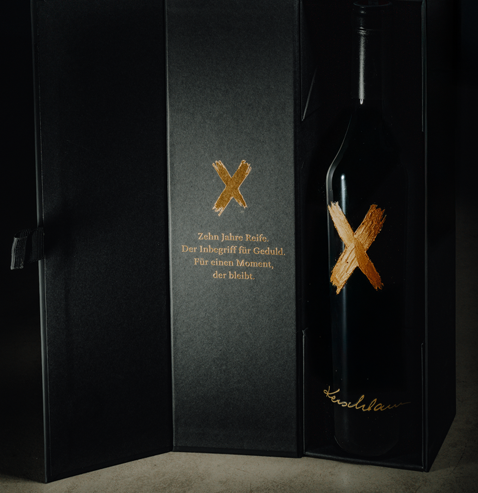 Außerdem entwickelten wir das Packaging Design: ein reduziertes Erscheinungsbild mit handgemaltem „X“ als Symbol dieser Dekade. Edle Zurückhaltung trifft auf präzise Gestaltung – BLAUFRÄNKISCH X ist kein Wein für den Moment, sondern einer, der bleibt.