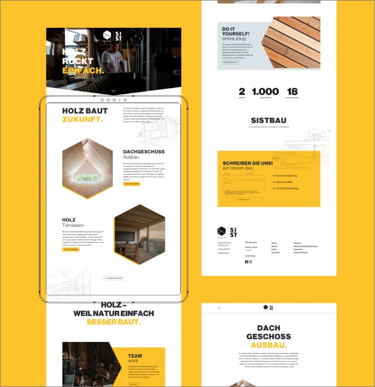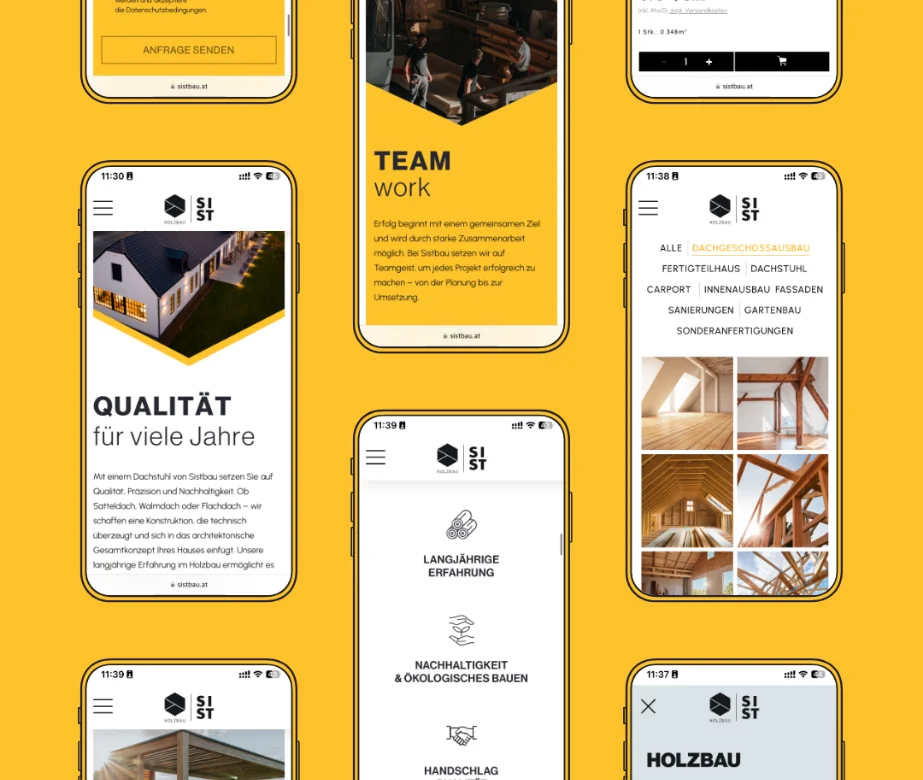 Für SIST Holzbau haben wir eine neue Website entwickelt, die mit einem frischen Design und modernem Branding überzeugt. Durch die Verwendung kontrastreicher Farben wie Gelb und Schwarz haben wir einen markanten Look geschaffen, der die Energie und Professionalität des Unternehmens widerspiegelt. Neue, hochwertige Fotos und grafische Elemente setzen die Leistungen und Referenzen von SIST Holzbau ins rechte Licht. Ein besonderes Highlight ist der coole Slogan „Holz rockt einfach!“, der das Team authentisch präsentiert und der Marke eine persönliche, moderne Note verleiht. Kurz gesagt: eine Website, die nicht nur gut aussieht, sondern auch richtig rockt.